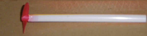 Der Strohhalm mit Schiffsschraube soll nicht am Holzdübel festgeklebt werden, sondern nur drauf geschoben, damit er für den Transport wieder abgezogen werden kann.